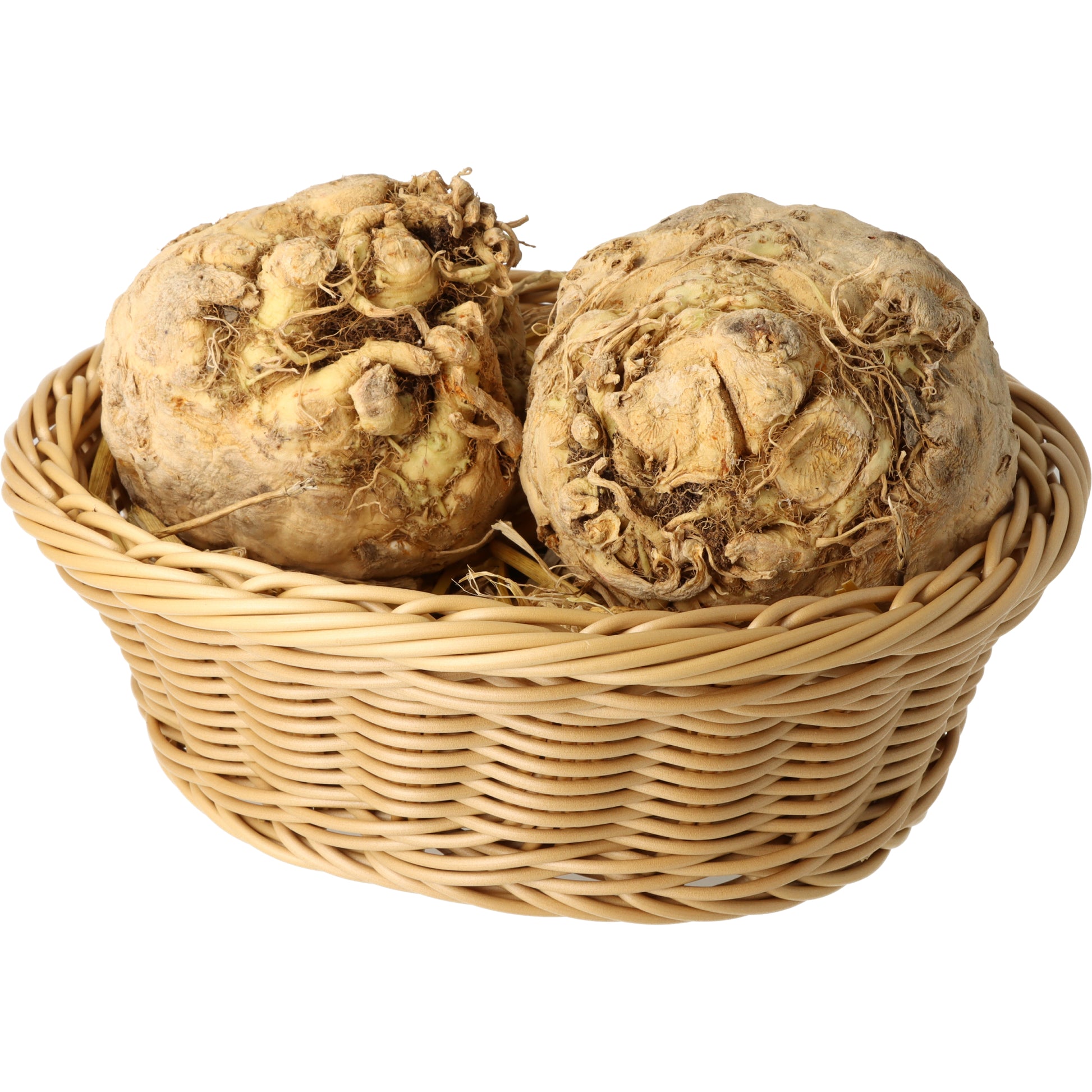 Farbe & Form: Hellbraune, runde Knollen mit festem, weißem Fleisch